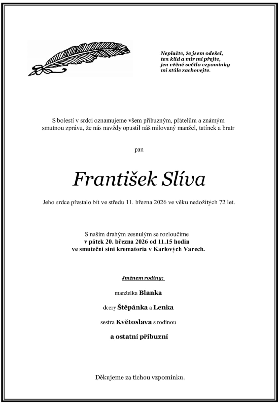 S hlubokým zármutkem jsme přijali zprávu o úmrtí našeho dlouholetého člena pana Františka Slívy. Po mnoho let byl nedílnou součástí našeho lyžařského klubu a svou přátelskou povahou, ochotou a podporou přispíval k jeho dobré atmosféře. Na společně prožitá léta budeme s úctou a vděčností vzpomínat.